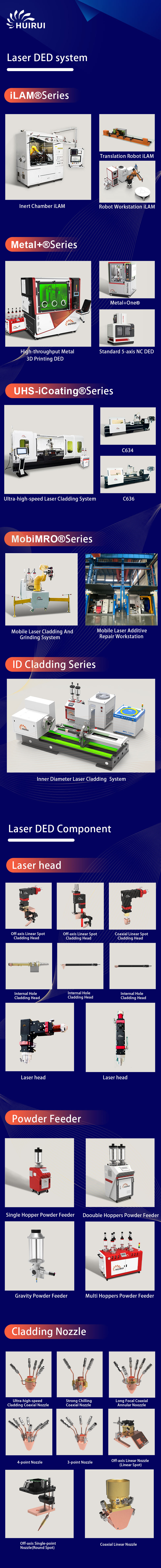 In order to meet different processing requirements, HUIRUI has developed four series of laser cladding equipment: iLAM robot series, Metal+ linear axis series, UHS ultra-high-speed series, and MobiMRO movable series. In order to meet the quality and precision requirements of different industrial applications of laser cladding, HUIRUI has developed a variety of powder feeders, cladding heads, and nozzles, which can help the users to achieve long-lasting and stable operation, and realise the refinement of production. production.