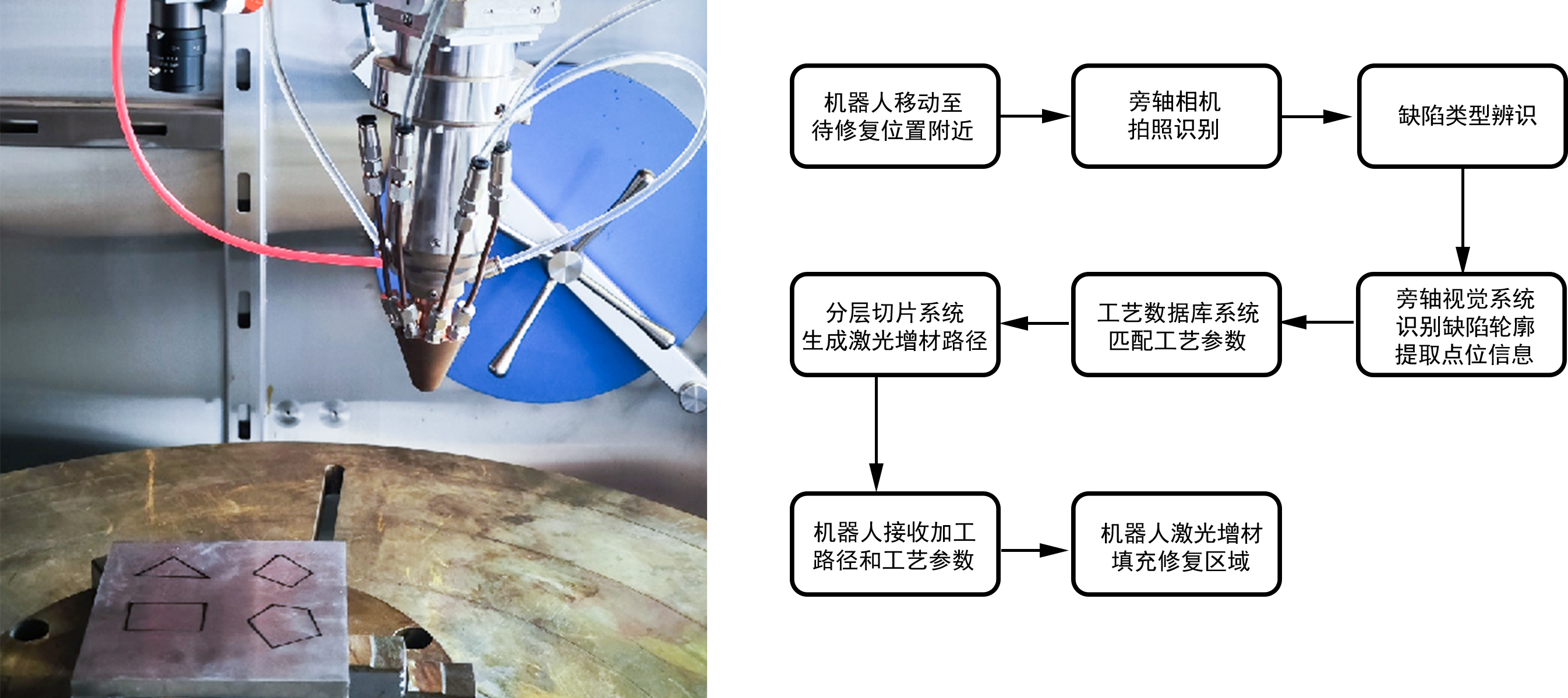 2, real-time imaging and closed-loop feedback control: real-time monitoring of the size, shape, temperature, etc. of the molten pool formed by laser cladding, and real-time capture and feedback of the relevant parameters to the control system for real-time adjustment, so as to obtain more stable and high-quality cladding effect;